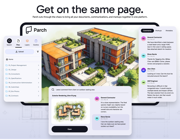 The result of these efforts is Parch, a web-based collaboration platform purpose-built for architects, engineers, and contractors at small firms. In essence, Parch acts as a digital overlay on a floor plan, allowing everyone on a project to literally get on the same page. “It’s essentially a design review platform for architects and designers,” Mohammed explains, describing Parch’s contextual interface. “You can review a floorplan and tag collaborators right where a change is needed, instead of dealing with endless email threads.”